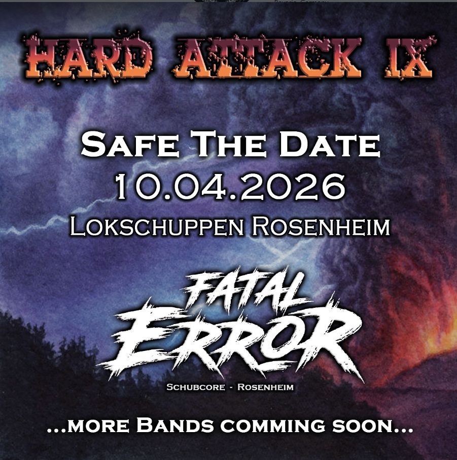 Compre boletos en línea. Venta anticipada del 16.01.2026 al 07.04.2026 Entradas para Hard Attack IXMit: Zodiac Ass / Fatal Error / T.B.A. / Don't Let This Be Your DeathwishBlackbox im Lokschuppen - Rathausstr. 26, 83022 RosenheimAdmisión a las 18:30 horas